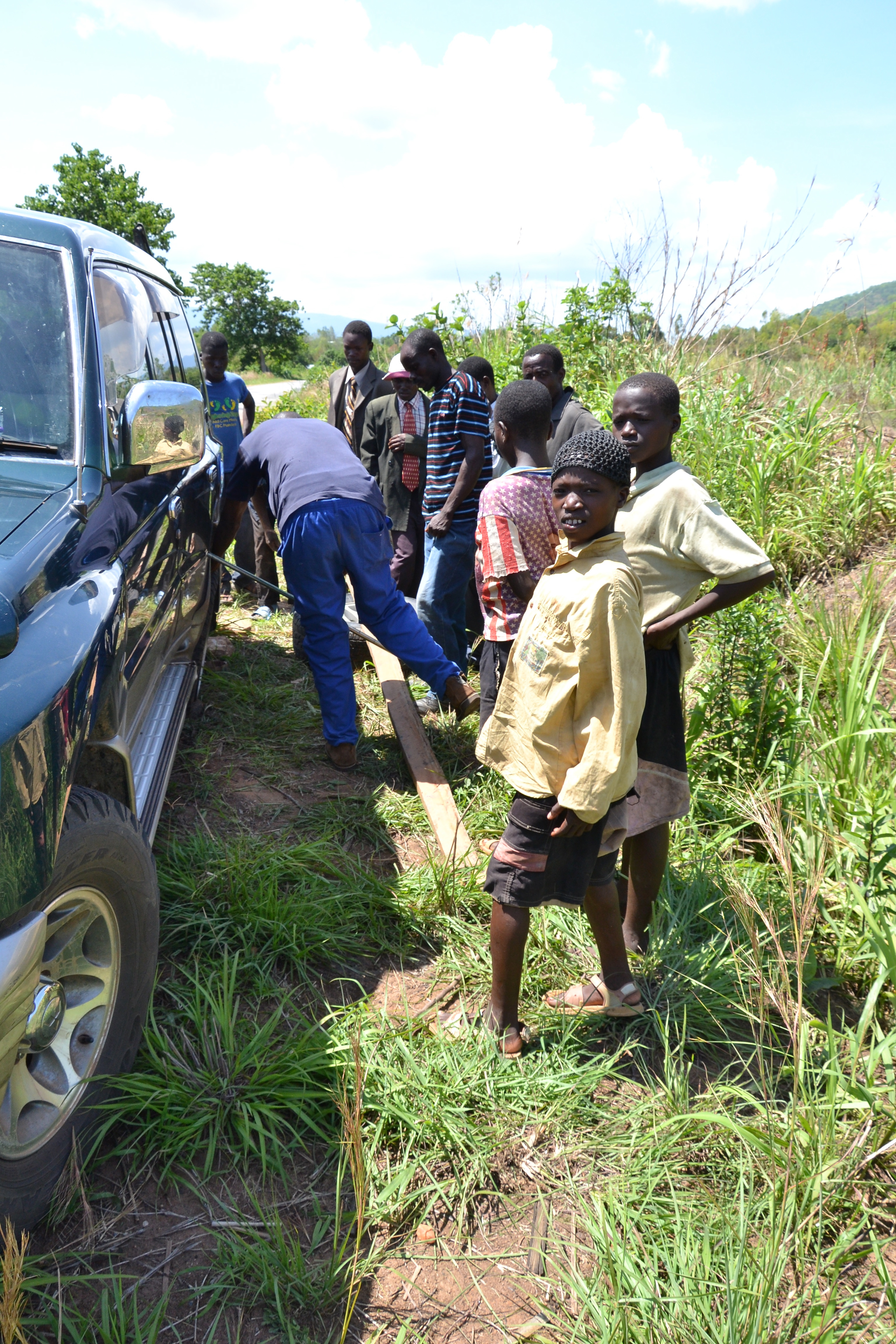 Somewhere between Mzuzu and Senga we got a flat tire. We thought we had left Kampala well-prepared for this eventuality, in that we had not one but two tires. We also had a jack. What we didn’t have, as it turned out, was the block that keeps the jack sufficiently elevated on soft ground.