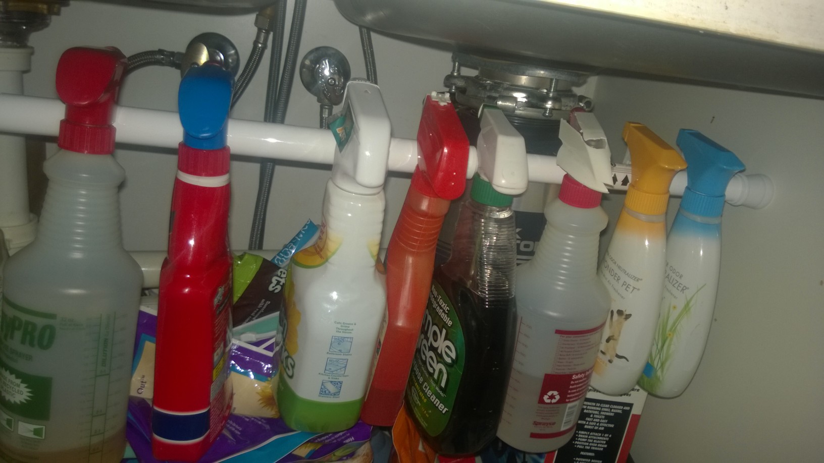 Trigger spray storage: I borrowed this one from some “life hacks” listicle – tension shower rod in a cabinet – in my case the cabinet under my kitchen sink = storage for a bunch of trigger spray bottles. Some hints; hang it low enough for the bottles to clear the top of the cabinet when you remove bottles and high enough to allow storage of other stuff underneath.